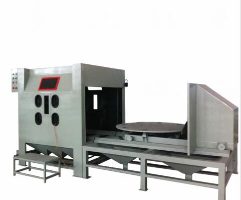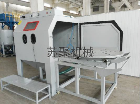 操作時將工件放置在臺車轉盤上,將臺車推入噴砂艙,即可關上艙門開始噴砂工作。